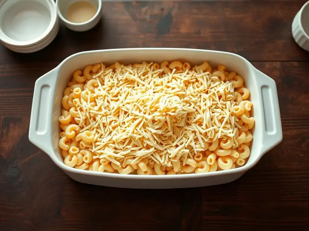 Combine sauce with pasta → half in dish → 1 cup reserved cheese → remaining mac → final 1 cup cheese.